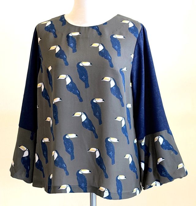 ポップなペリカン柄シフォンのブラウス。再入荷しています。 腕の部分はエンボス加工された花柄シフォンを組み合わせています。 袖の先にはゴ...