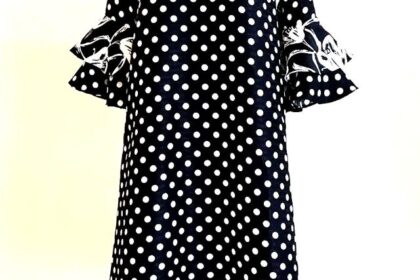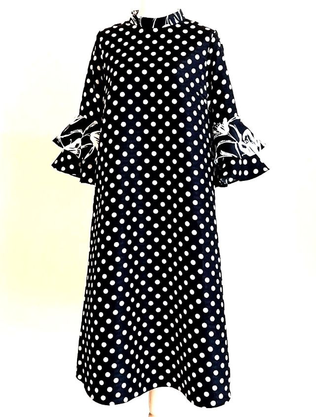 定番のドット柄を使ったフリル袖ワンピース。 低めのスタンド襟と2段フリルの袖で 一味違う 仕上がりになっています。お出かけ着としても◎...