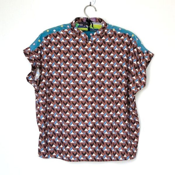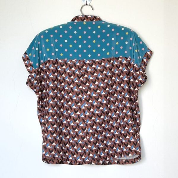 レトロな幾何学模様とポップな水玉柄のゆったりブラウス。