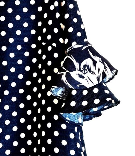 低めのスタンド襟と2段フリルの袖で 一味違う