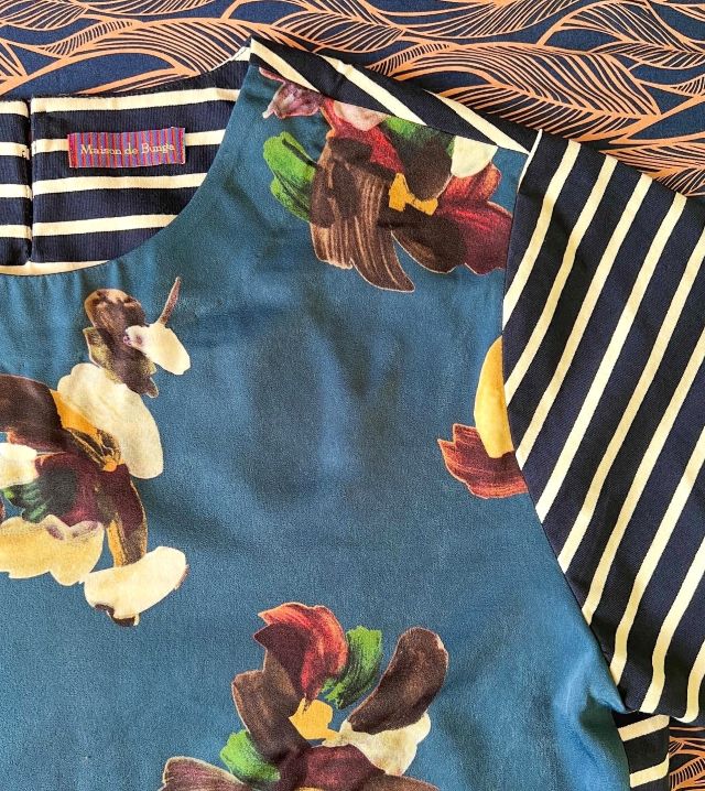 しっかり目の厚み(スウェットまでは行きません)のある ブルー×白のボーダー柄ストレッチコットンを使いました。 襟まわりは紺色のレースを...